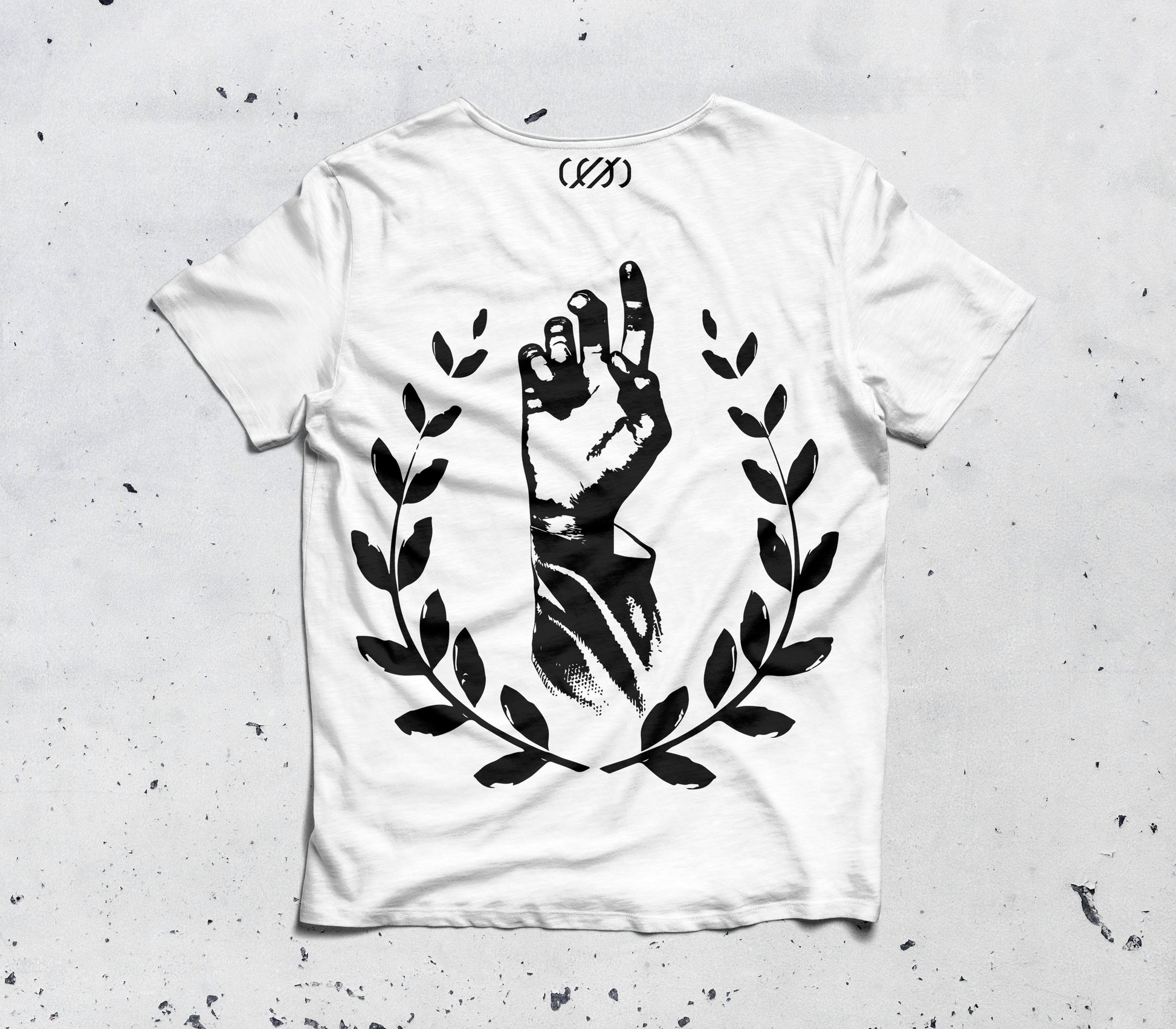 Gráfico trasero con mano en gesto de victoria y corona de laurel